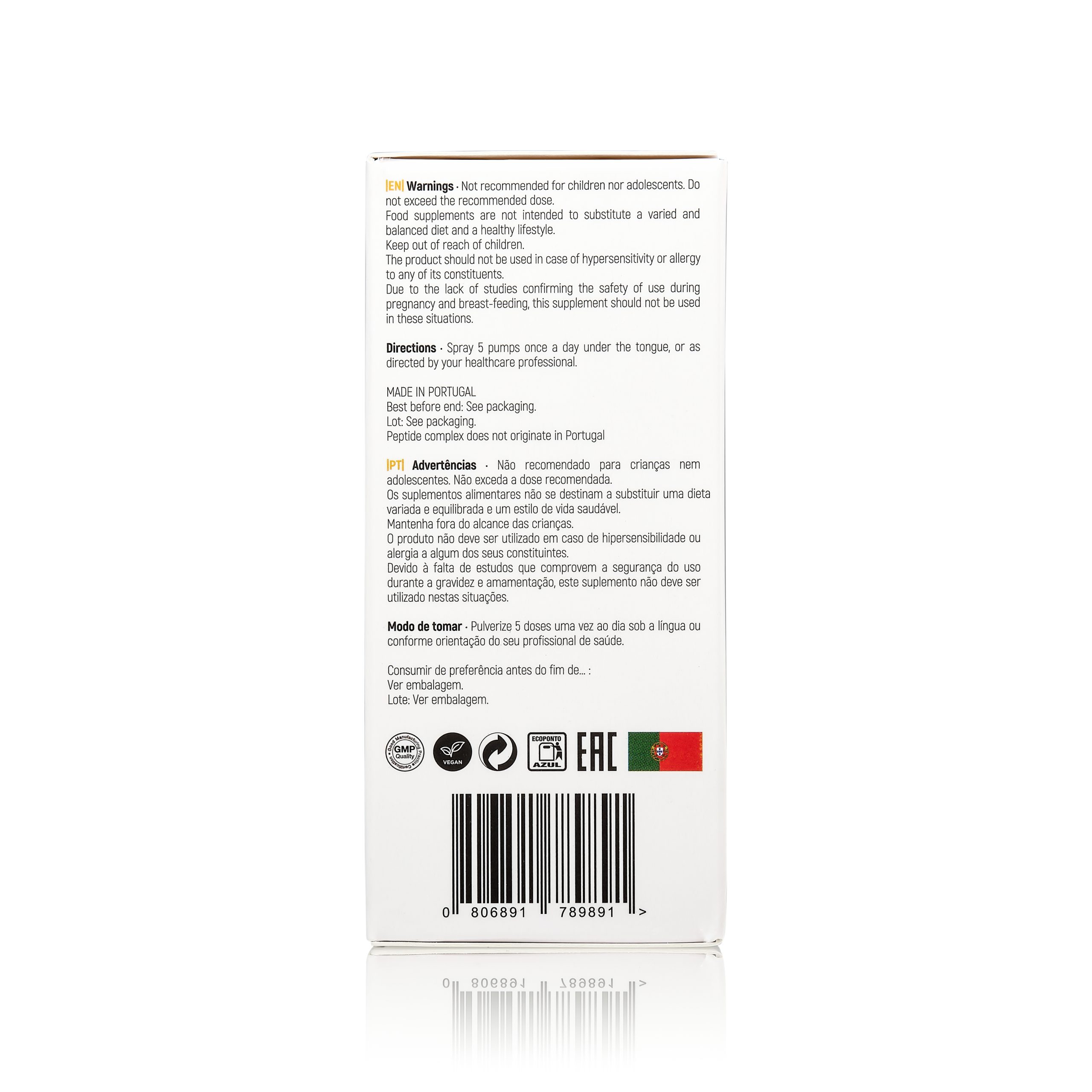 Ingredients: Purified water; Preservatives: Sodium Benzoate, Potassium Sorbate; Peptide complex (Alanine, Glutamic acid, Aspartic acid, Glycine).