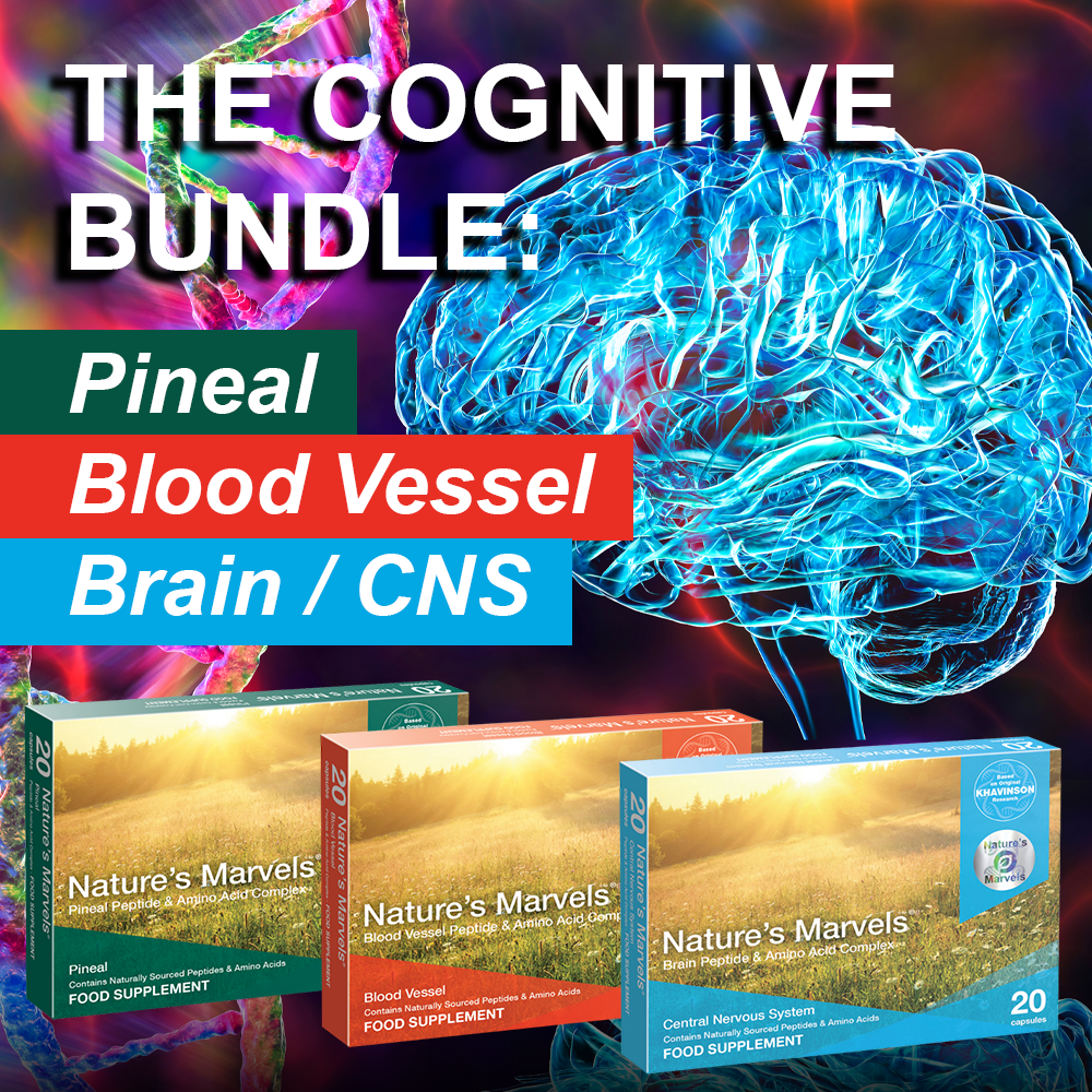 The Cognitive Stack combines three potent Nature’s Marvels® Bioregulator complexes: Pineal, Brain/CNS and Blood Vessel.