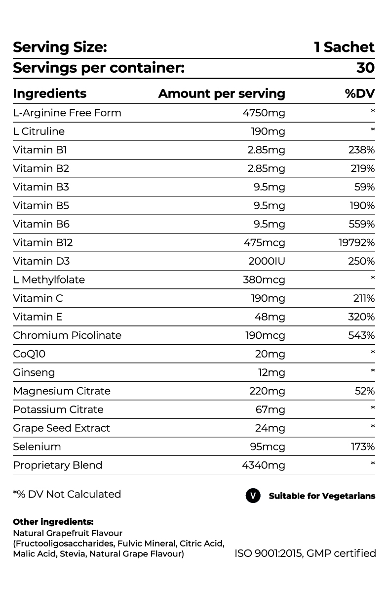 NitricPro™ has been scientifically formulated to naturally elicit a strong release of nitric oxide within the body. The body’s natural source to produce nitric oxide is from L-Arginine, L-Citrulline and oxygen, this is why each sachet of Nitric-Pro™ contains a whopping 4,750 mg of arginine, along with many other natural ingredients that enhance and support its role, ensuring your Nitric Oxide levels are topped right up, giving all the incredible benefits of healthy Nitric Oxide levels.